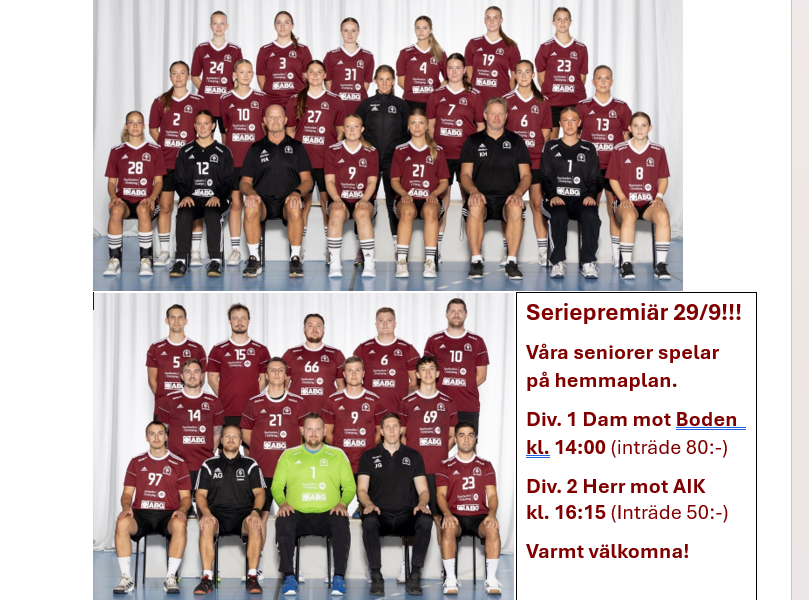 Kom ner till Ekhammarhallen och heja fram våra lag!!! Kl. 14:00 Div. 1 Dam, KSK - Boden Kl. 16:15 Div. 2 Herr, KSK - AIK Inträde: Div. 1 Dam; 80:- Div. 2 Herr; 50:- Pensionärspris för respektive match är 60:- och 40:-. Kostnad för bägge matcherna är 100:-, pensionär betalar 80:-. Årskort finns att köpa i hallen á 750:- (600:- för pensionär). Vi ses väl?! Välkomna! Kungsängen Handboll 25 sep 2024 0kommentarer