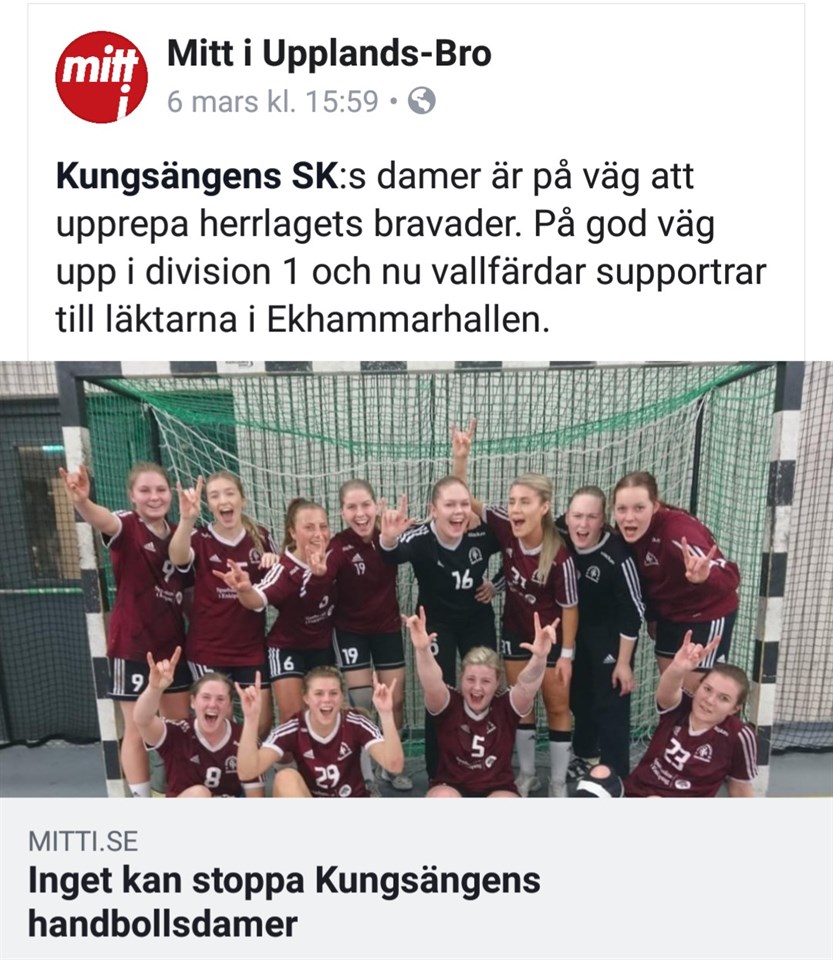 Så här skriver tidningen Mitt i om Kungsängens damlag: KOPIERA LÄNKEN: https://mitti.se/sport/stoppa-kungsangens-handbollsdamer/?omrade=upplandsbro